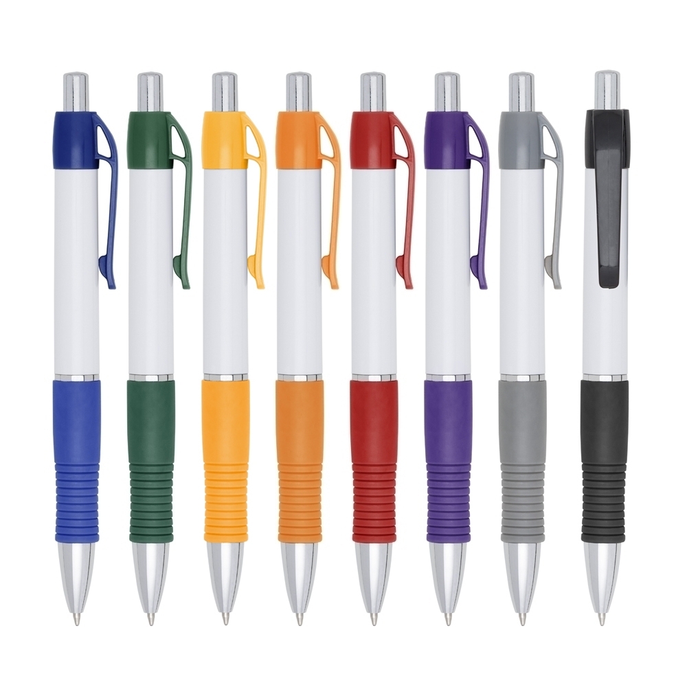 Caneta plástica com detalhe emborrachado, carga esferográfica azul 1.0 mm e acionamento por clique. 03011C