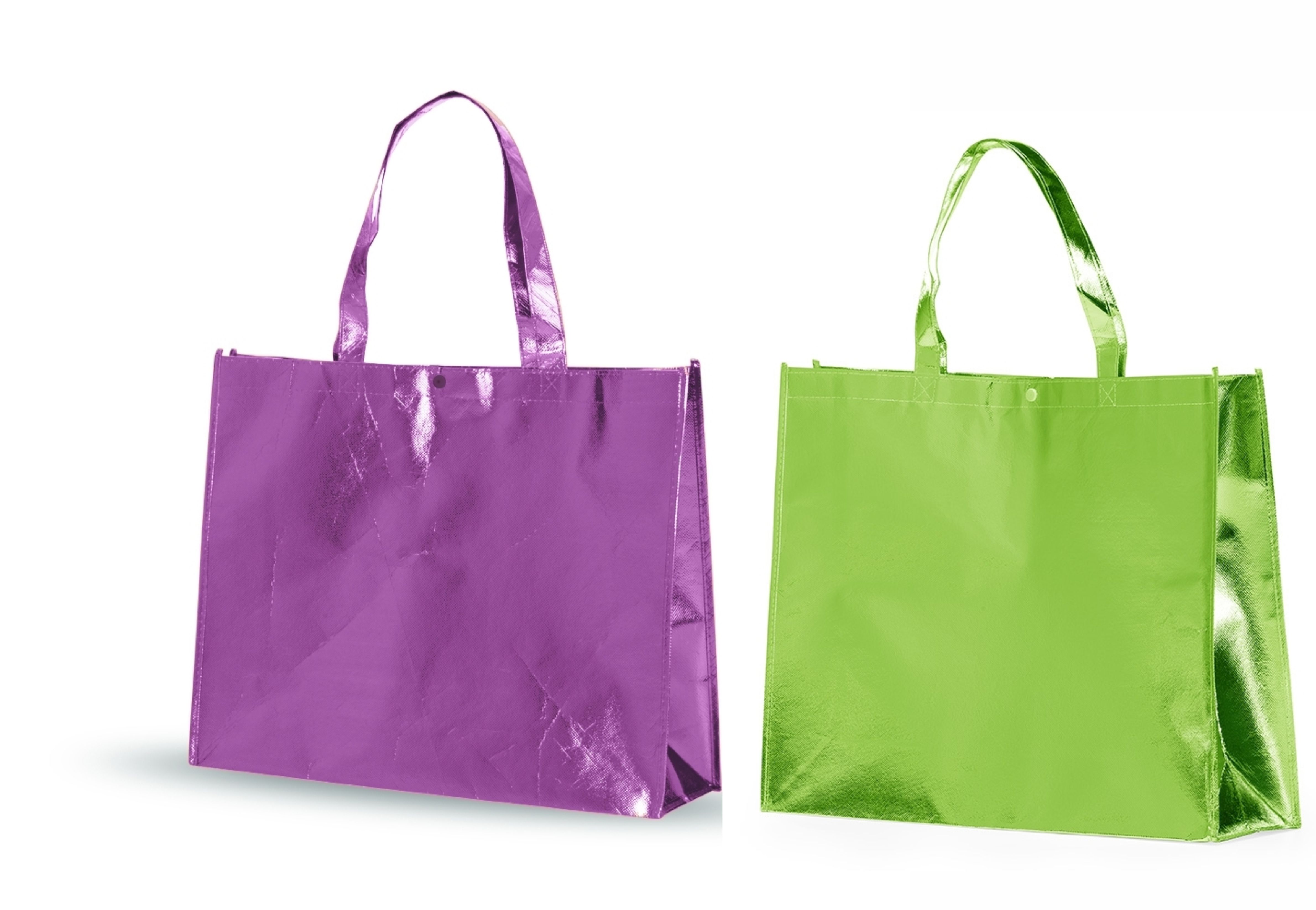 Sacola TNT metalizada 110g/m² com botão. Confeccionado em TNT com revestimento plástico laminado, parte superior possui botão plástico para fecho. 18537P